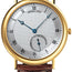 Preowned - 5140BA/12/9W6 Breguet. The Breguet Classique 5140BA/12/9W6 is a luxury watch with a 40.00 mm case made of 18K yellow gold, giving it a classic and sophisticated appearance. The fixed 18K yellow gold bezel and crown add to its elegance. The solid gold dial features silvering and hand guilloché, with blued steel Breguet hands finished by hand. The satin-brushed circle with hour markers features Roman numerals and minute markers engraved, adding to the classic look of the watch. The sub-dial of small second is located between the 4 and 5 o'clock positions, providing additional information without cluttering the main dial. The watch performs the following functions: hours, minutes, and small seconds. The self-winding mechanical movement is powered by a Calibre 502 SD, which has a power reserve of approximately 46 hours, ensuring that the watch can last for days without needing to be wound. The case thickness is 10.8 mm, making it a comfortable fit on the wrist. The case back is solid, and the sapphire crystal protects the front side of the watch, providing durability and protection. The alligator leather strap with pin clasp is both comfortable and durable. The watch is water-resistant up to 30m, making it suitable for everyday wear and protection from splashes and brief immersion in water, but it is not recommended for swimming or diving. Overall, the Breguet Classique 5140BA/12/9W6 is a stunning and functional timepiece that is sure to impress anyone who appreciates fine watchmaking craftsmanship.