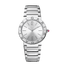 Bvlgari Bvlgari Lady watch with quartz movement, 33 mm stainless steel case, stainless steel bezel engraved with double logo, silvered sunray dial, stainless steel crown set with a cabochon-cut pink rubellite and stainless steel bracelet. Water-resistant up to 30 meters.