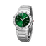 Bvlgari has been reinventing classic inspirations into pioneering designs for over 40 years. Bvlgari Bvlgari was the very first watch to use a logo as an element of design, an exquisite example of the brand’s creativity and craftsmanship. A frontrunner in today’s “logomania” movement; the distinctive double circular engraving was initially inspired by the curved inscriptions on ancient coins, growing from the Roman roots of the brand into an elegant fusion of culture and modernity, a true representation of everyday glamour. Bvlgari Bvlgari Lady watch with quartz movement, 33 mm stainless steel case, stainless steel bezel with logo, stainless steel crown set with a synthetic cabochon-cut rubellite, green sun-brushed dial, date window and stainless steel bracelet.