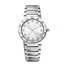 Bvlgari Bvlgari Lady watch with quartz movement, B043 caliber, 33 mm stainless steel case, stainless steel bezel engraved with double logo, silver dial, 12 round brilliant-cut diamond indexes (about 0.20 ct), stainless steel crown set with a cabochon-cut synthetic pink rubellite and stainless steel bracelet. Water-resistant up to 30 meters
