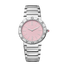 Bvlgari Bvlgari watch with quartz movement, 33 mm stainless steel case, stainless steel bezel engraved with double logo, pastel pink lacquered dial, 12 applied indexes, silver colured hands, stainless steel crown set with a cabochon-cut pink rubellite, polished and satin-brushed stainless steel bracelet. Water-resistant up to 30 meters.