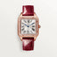 WJSA0017 Cartier Santos The Cartier Santos WJSA0017 is an exquisite ladies' watch that features an 18K rose gold case with a dimension of 38mm x 27.5mm. The bezel of the watch is fixed and set with 44 brilliant-cut diamonds, weighing a total of 0.53 carats. The crown of the watch is also adorned with one brilliant-cut diamond. The silver satin-brushed dial of the watch has a sunray effect and is embellished with black Roman numerals and blued-steel sword-shaped hands. The minute markers of the watch are designed in the form of a railway track. This timepiece is powered by a high autonomy quartz movement that has a lifespan of approximately six years. The watch is 7.3 mm thick and has a solid case back. The front side of the watch is protected by a scratch-resistant sapphire crystal. The watch has a Bordeaux shiny alligator leather strap with an 18K rose gold ardillon buckle. The watch is water-resistant up to 30 meters, which makes it suitable for everyday wear but not suitable for swimming or diving activities. The watch performs two functions, which are hours and minutes. This beautiful and luxurious timepiece is perfect for women who appreciate fine craftsmanship, elegant design, and timeless style.