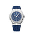 298609-3003 Chopard. The Chopard Alpine Eagle XL Chrono 298609-3003 is a striking and durable timepiece. The watch features a 44mm stainless steel case with a fixed stainless steel bezel secured with eight screws, giving it a robust and sporty appearance. The blue dial of the watch has a textured striped pattern reminiscent of an eagle's eye, adding to its unique design. The silver-tone hands are easy to read against the blue background, and the index hour markers and Roman numerals at the 12 o'clock position provide clear timekeeping. The sub-dial of small seconds is located at the 6 o'clock position, and the sub-dial of 30-minute counter is at the 3 o'clock position, while the sub-dial of 12-hour counter is at the 9 o'clock position. The date window is located between the 4 and 5 o'clock position, and the Chopard logo is under the 12 o'clock position. The watch performs various functions, including hours and minutes, small seconds, date, chronograph seconds hand, 30-minute counter, and 12-hour counter, providing a comprehensive range of timekeeping capabilities. The watch is powered by a self-winding mechanical movement, a Chopard calibre 03.05-C, with 45 jewels and a power reserve of approximately 60 hours. The watch has a beating rate of 28,800 vph, providing precise and accurate timekeeping. The watch has a scratch-resistant sapphire crystal that protects the dial from scratches and damage. The case back of the watch is transparent, providing a view of the intricate inner workings of the watch. The watch has a blue rubber strap with a tang buckle that provides a comfortable and secure fit. The watch is water-resistant up to 100 meters, making it suitable for swimming and snorkeling. Overall, the Chopard Alpine Eagle XL Chrono 298609-3003 is a robust and stylish timepiece suitable for those who want a watch that is both durable and elegant. The watch's various functions and intricate design make it a standout piece, while its durable construction ensures it will stand up to daily wear and tear.