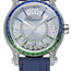 274891-1027 Chopard The Chopard Happy Sport 274891-1027 is a stunning timepiece designed for women who appreciate luxury and fine craftsmanship. It features an elegant 36mm case made of 18kt white gold and a gorgeous blue alligator leather strap with a tang clasp. The bezel is fixed with an array of dazzling diamonds, sapphires, and emeralds, making this watch a true showstopper. The silver-tone hands and Roman numeral/colored stone index hour markers on the light blue mother-of-pearl dial are paired with seven floating diamonds, which move gracefully within the watch. This innovative design is what sets the Happy Sport apart from all other timepieces. The watch's automatic movement has a 42-hour power reserve and functions for hours, minutes, seconds, and power reserve. In addition to its stunning look and movement, the Chopard Happy Sport 274891-1027 also features scratch-resistant sapphire crystal and a transparent case back, allowing watch enthusiasts to marvel at the intricate mechanisms inside. Its round case shape measures 36mm in diameter and 12.65mm in thickness, making it a perfect size for a statement piece. With a water resistance rating of 30 meters or 100 feet, this watch is also suitable for daily wear.