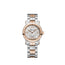 278573-6017 Chopard. The Chopard Happy Sport 278573-6017 watch features a 30mm stainless steel case with a fixed ethical rose gold bezel. The silver-colored dial with a guilloche center has rose gold-tone hour markers, complemented by leaf-shaped hands and Roman numeral hour markers. The dial also features five dancing diamonds, adding a touch of elegance and luxury to the watch. The watch performs basic timekeeping functions such as hours, minutes, and seconds, and is powered by a self-winding mechanical movement containing 27 jewels with a power reserve of approximately 42 hours. The scratch-resistant sapphire crystal adds durability to the watch, and the case back is transparent, providing visibility of its inner workings. The watch has a case thickness of 11.23mm and is paired with a stainless steel and ethical rose gold bracelet that has a folding clasp buckle, for a comfortable and secure fit on the wrist. The watch is also water-resistant up to 30 meters or 3 ATM, making it suitable for daily wear. Overall, the Chopard Happy Sport 278573-6017 is a luxurious watch that showcases elegant features such as the dancing diamonds and the leaf-shaped hands index. The combination of stainless steel and ethical rose gold adds sophistication to the watch, while its water resistance and scratch-resistant sapphire crystal make it durable and practical for everyday use.