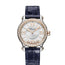278608-6003 Chopard The Chopard Happy Sport 278608-6003 is another luxurious timepiece with a 33mm stainless steel case, a fixed bezel set with diamonds and ethical rose gold, and a silver-toned dial with a guilloche center and rose gold-tone hour markers. The dial features five dancing diamonds and leaf-shaped hands index that complements the Roman numeral hour markers. The watch performs the functions of hours, minutes, and seconds and has a self-winding mechanical movement, powered by a Calibre 09.01-C with 27 jewels to ensure precision and reliability. The power reserve of the watch is approximately 42 hours, with a case thickness of 10.84mm and a sapphire crystal with a transparent case back. The watch comes with a blue alligator leather strap (glossy) that is fitted with a steel pin clasp buckle for a comfortable and secure fit. Additionally, the watch is water-resistant up to 30m, making it suitable for water activities. Overall, the Chopard Happy Sport 278608-6003 is a stunning timepiece that combines traditional watchmaking and ethical sourcing, making it a great addition to any watch collection.