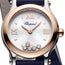 278620-6001 Chopard This Watch comes with 25 mm Stainless steel case. Fixed 18K Rose Gold bezel. Silver-colored dial with sunburst satin - brushed finish. The dial with five dancing diamonds (~0.09 cts). Rose gold Roman nymerals and hour markers. Roman numerals appear at the 3, 6, 9 and 12 o’clock positions. Rose gold leaf-shaped hour hands. The watch performs following functions: hours, minutes. Quartz movement. Case Thickness - 8.74 mm. Case back is solid. Sapphire crystal protects front side of the watch. Blue calfskin leather strap with pin buckle. This model is water-resistant up to 30 m.