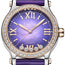 278608-6012 Chopard This Watch comes with 33 mm stainless steel case. Fixed 18k rose gold bezel set with diamonds. Purple textured mother-of-pearl dial. The dial with five dancing diamonds. Total weight of diamonds ~1.49 cts. Rose gold Roman nymerals and hour markers. Roman numerals appear at the 3, 6, 9 and 12 o’clock positions. Rose gold tone leaf-shaped hour hands. Central second hand. The watch performs following functions: hours, minutes, seconds. Self-winding mechanical movement is powered by a ?alibre 09.01-C. 27 Jewels. Case Thickness - 10.84 mm. Case back is transparent. Sapphire crystal protects front and back side of the watch. Violet alligator leather strap with tang buckle. This model is water-resistant up to 30 m.