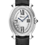 Preowned - 27/8419-23 Chopard This watch comes with 31 mm Stainless Steel case. Fixed Stainless Steel bezel set with diamonds. White dial. The dial with seven dancing diamonds. The blue leaf-shaped hands richly complement the black Roman numeral hour markers. Roman numerals appear at the 3, 6, 9 and 12 o’clock positions. Minute marks in the form of railroad tracks. Central second hand. The date window is located at the 6 o'clock position. The watch performs following functions: hours, minutes, seconds, date. Quartz movement. Case Thickness - 15 mm. Case back is solid. Sapphire crystal protects front side of the watch. Black alligator leather strap with stainless steel clasp buckle. This model is water-resistant up to 30 m.
