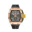 The RM 11-03 is designed in a 50mm rose gold case and styled on a rubber strap. It features a skeletonized dial with white numerals, offering analog time function, flyback chronograph, 60-minute countdown timer and oversized date display. The black rubber bracelet embodies the brand's signature racing aesthetic.