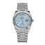 The Oyster Perpetual Day-Date is inlaid in a sophisticated 36mm Platinum case surrounding an ice blue dial set with baguette cut diamonds in 18 ct gold settings. The signature fluted bezel is an aesthetic element and distinctive feature for the Rolex brand. The symbolic platinum presidential bracelet includes semi-circular three-piece links and concealed crown clasp.