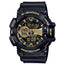 From super-tough G-SHOCK comes a new collection of GA-400 with a large rotary switch for intuitive operation. Basic G-SHOCK black is accented in gold to create a HIP-HOP artist or B-BOY fashion item motif. Black with gold, which are employed in a large number of accessories, is used on the case, band, and face, for a boldly cool design. ISO764 class magnetic resistance- Rotary switch