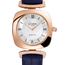 The white mother-of-pearl dial with guilloché center and black Roman numerals. Red gold-tone hour hands. This watch is powered by a Calibre 03-02 quartz movement and boasts a power reserve of approximately 48 months on a fully charged battery, ensuring precision and reliability.