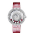 204445-1006 Chopard The Chopard Happy Diamonds 204445-1006 is a ladies' watch with exquisite timepiece boasts a 37.70 mm round 18K White Gold case complete with a dazzling Diamonds bezel that exudes elegance and glamour. The high-quality textured mother-of-pearl dial is adorned with five moving Diamonds and five Ruby hearts, adding a touch of charm and liveliness to this already stunning design. The 18K White Gold crown adds a regal touch while the glossy red alligator leather strap with an 18K White Gold pin buckle creates the perfect balance between bold and delicate. With water resistance up to 30 meters (100 feet), this watch is perfect for any adventure, whether it's a luxurious night out or a day of sporty activities.