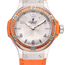 Preowned-361.SO.6010.LR.1906 Hublot  This watch has a 38 mm Stainless steel case with orange composite resin lateral case inserts & bezel lug. Solid 18kt white gold bezel with 48 baguette cut orange sapphires mineral stones. Mother of pearl dial. Polished hands, the hour & minute hands with luminous tips. Silvery Arabic numerals and applied hour markers. Arabic numerals appear at the 2, 4, 6,8,10 and 12 o’clock positions. Central second hand. Fine printed minute/seconds track on the dial perimeter. The watch performs following functions: hours, minutes, seconds. Quartz movement is powered by a ?alibre HUB2900. Case back is solid. Sapphire crystal protects front side of the watch. Orange leather and rubber strap with folding clasp buckle. This model is water-resistant up to 100 m.