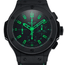 Preowned-301.CI.1190.GR.ABG11 Hublot. The Hublot Big Bang 301.CI.1190.GR.ABG11 is a bold and sporty watch that features a black ceramic case with a fixed ceramic bezel, giving it a sleek and modern look. The watch has a black dial with green-tone luminous hands and index hour markers, making it easy to read even in low light conditions. The minute markers are located around the outer rim, adding to the watch's functionality. The watch features three sub-dials, including a 30-minute counter located at the 3 o'clock position, a 12-hour counter at the 6 o'clock position, and a seconds display at the 9 o'clock position. The date window is located between the 4 and 5 o'clock positions, adding to the watch's practicality. The watch has an alligator black leather strap with a deployant clasp, providing a secure and comfortable fit. The watch is powered by the HUB 4100 Caliber automatic movement, which provides a power reserve of up to 42 hours. The watch is water-resistant up to 50 meters or 165 feet, making it suitable for everyday wear but not recommended for swimming or diving. Overall, the Hublot Big Bang 301.CI.1190.GR.ABG11 is a stylish and functional watch that is perfect for those who appreciate a bold and sporty timepiece.