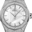 550.NS.2200.RW.1604.ORL20 Hublot. The Hublot Classic Fusion Orlinski 550.NS.2200.RW.1604.ORL20 is a luxury watch with a polished titanium case that measures 40mm in diameter. The case is set with a total of 210 diamonds, weighing approximately 1 carat in total. The fixed bezel is also polished titanium and is set with 54 diamonds totaling around 0.6 carats. The bezel is secured with 6 H-shaped titanium screws. The watch features a polished faceted white dial with silver-tone hands and applied polished silver-tone hour markers. The central second hand adds to the watch's functionality. The watch performs the following functions: hours, minutes, and seconds. It has a self-winding mechanical movement, which is powered by a Calibre HUB1100, providing a power reserve of approximately 42 hours. The case back of the watch is transparent, allowing the wearer to see the movement inside. The watch is protected by sapphire crystal on both the front and back sides. The white rubber straps are complemented with a stainless steel deployant buckle clasp, making it easy to put on and take off. The watch is water-resistant up to 50 meters, making it suitable for swimming and snorkeling, but not for diving. Overall, the Hublot Classic Fusion Orlinski 550.NS.2200.RW.1604.ORL20 is a high-end timepiece that boasts luxury, style, and functionality. It is a great choice for those who appreciate fine craftsmanship, attention to detail, and a touch of glamour.