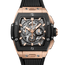 642.OM.0180.RX Hublot. The Hublot Spirit of Big Bang Chronograph 642.OM.0180.RX is a luxurious watch with a 42mm case made of satin-finished and polished 18K king gold. The bezel is made of satin-finished, polished, and microblasted black ceramic with 6 H-shaped titanium screws. The skeleton dial features rose gold-tone luminescent hands and applied polished rose gold-tone luminescent hour markers, with a central second hand and the signature Hublot logo at the 12 o'clock position. The watch has three chronograph sub-dials located at 3, 6, and 9 o'clock, as well as a date window between the 4 and 5 o'clock positions. The watch offers several functions, including hours, minutes, seconds, date, and chronograph. The watch is powered by a self-winding mechanical movement, the Calibre HUB4700, which has a power reserve of approximately 50 hours. The case back is transparent, allowing you to view the intricate inner workings of the movement. The front and back sides of the watch are protected by sapphire crystal. The black rubber strap features an 18K king gold and black PVD titanium deployant buckle clasp, adding to the luxury and durability of the watch. This model is also water-resistant up to 100 meters, making it suitable for swimming and snorkeling. Overall, the Hublot Spirit of Big Bang Chronograph 642.OM.0180.RX is a beautiful timepiece that combines elegant design with advanced functionality.