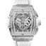642.NE.2010.RW.1204 Hublot. The Hublot Spirit of Big Bang Chronograph 642.NE.2010.RW.1204 is a sophisticated timepiece that combines luxury and functionality. It features a 42mm satin-finished and polished titanium case, with a satin-finished and polished titanium fixed bezel, set with 48 diamonds and 6 H-shaped titanium screws. The watch has a skeleton dial with silvery luminescent hands, applied polished silvery luminescent hour markers, and a central second hand. It also features a signature at the 12 o'clock position and a date window located between the 4 and 5 o'clock positions. The watch has three chronograph sub-dials at 3, 6, and 9 o'clock. The watch is powered by a self-winding mechanical movement, the Calibre HUB4700, which has a power reserve of approximately 50 hours. The case back is transparent, allowing you to see the inner workings of the watch, and the front and back of the watch are protected by scratch-resistant sapphire crystal. The white rubber strap with a titanium deployant buckle clasp is comfortable to wear and adds to the watch's overall style. Additionally, the watch is water-resistant up to 100 meters, making it suitable for swimming and snorkeling. In summary, the Hublot Spirit of Big Bang Chronograph 642.NE.2010.RW.1204 is an exceptional timepiece that offers both style and function. It is an excellent choice for those who appreciate the finer things in life and are looking for a watch that makes a statement.