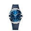 The dramatic and enduring design of the OMEGA Constellation is characterised by its famous half-moons, as well as the ''claws'' on the side of the case.This 41 mm stainless steel model features a polished blue ceramic bezel with Roman numerals in Liquidmetal, a sun-brushed blue dial and a date window at the 6 o'clock position. The hands, OMEGA logo, Constellation star and facetted indexes are all rhodium-plated.Presented on a blue leather strap with rubber lining, this timepiece is driven by the OMEGA Co-Axial Master Chronometer Calibre 8900, visible through the domed scratch-resistant sapphire crystal. 5 bar (50 metres / 167 feet)