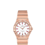 131.55.28.60.55.004 Omega The Omega Constellation Quartz 131.55.28.60.55.004 is a luxurious women's watch with a 28mm 18K Sedna™ Gold case and an 18K Sedna™ Gold fixed bezel with delicate Roman numerals and 154 snow pavé diamonds. The crown is also made of 18K Sedna™ Gold, adding to the watch's elegance. The watch features a white mother-of-pearl dial with baguette-cut ruby hour markers and 18K rose gold skeletonized hour hands. The Omega logo is located below the 12 o'clock position, adding to the watch's sophistication. The watch performs basic functions of hours and minutes, powered by a quartz movement with a Calibre 4061. The battery life is 48 months, providing long-lasting convenience. The case thickness is 8.7 mm, making the watch slim and stylish. The case back is solid and the front of the watch is protected by sapphire crystal, which is highly resistant to scratches and impacts. The 18K Sedna™ Gold bracelet with a folding buckle provides comfort and security on the wrist. The watch is water-resistant up to 30 meters, which means it can withstand splashes of water and rain but should not be worn while swimming or diving. Overall, the Omega Constellation Quartz 131.55.28.60.55.004 is a luxurious and stylish timepiece suitable for special occasions and everyday wear. The baguette-cut ruby hour markers and snow pavé diamonds on the bezel make it a stunning and unique addition to any collection.