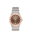 131.20.28.60.63.001 Omega The Omega Constellation Quartz 131.20.28.60.63.001 watch has a 28mm stainless steel case with an 18K Sedna™ gold fixed bezel that has engraved Roman numerals. The crown is also made of 18K Sedna™ gold. The watch features a sun-brushed brown dial with diamond hour markers and 18K rose gold skeletonized hour hands. The watch functions with hours and minutes only and is powered by a quartz movement, specifically the Calibre 4061, which has a battery life of 48 months. The Omega logo is located below the 12 o'clock position. The case thickness is 8.5mm and the case back is solid. The front of the watch is protected by a sapphire crystal. The watch also comes with a stainless steel and 18K Sedna™ gold bracelet with a folding buckle. The water resistance of the watch is up to 30m, which means it can withstand splashes of water but is not suitable for swimming or diving. Overall, this watch is a combination of luxurious materials and modern technology that creates a classic yet elegant timepiece suitable for daily wear.