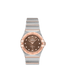 131.20.25.60.63.001 Omega The Omega Constellation Quartz 131.20.25.60.63.001 is a women's wristwatch with a 25 mm stainless steel case and a fixed 18K Sedna™ Gold bezel engraved with Roman numerals. The watch features a crown made of 18K Sedna™ Gold and a sun-brushed brown dial with diamond hour markers. The hour hands are skeletonized and made of 18K Sedna™ Gold. The watch performs the basic functions of hours and minutes, and is powered by a quartz movement (Calibre 4061) with a battery life of 48 months. The Omega logo is located below the 12 o'clock position on the dial. The case thickness of the watch is 8.1 mm and the case back is solid. The front of the watch is protected by a sapphire crystal. The watch comes with a stainless steel and 18K Sedna™ Gold bracelet with a folding buckle. The water resistance of the watch is up to 30 meters. The sun-brushed brown dial of the watch, with diamond hour markers, adds a touch of luxury and elegance to the overall design. This watch is a perfect combination of classic and modern elements, making it suitable for any occasion. Overall, the Omega Constellation Quartz 131.20.25.60.63.001 is a stunning and sophisticated timepiece that will make a perfect addition to any collection.