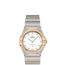 131.25.28.60.55.002 Omega The Omega Constellation Quartz 131.25.28.60.55.002 is a luxurious women's watch with a 28 mm stainless steel case and an 18K yellow gold fixed bezel that is paved with diamonds. The crown is also made of 18K yellow gold. The watch features a white mother-of-pearl dial with diamond hour markers and 18K yellow gold skeletonized hour hands. This watch performs basic functions of hours and minutes and is powered by a quartz movement with a Calibre 4061. The battery life of the watch is 48 months. The Omega logo is located below the 12 o'clock position on the dial. The case thickness of the watch is 8.5 mm and the case back is solid. The front of the watch is protected by a sapphire crystal. The watch comes with a stainless steel and 18K yellow gold bracelet that has a folding buckle. The water resistance of the watch is up to 30 meters. Overall, the Omega Constellation Quartz 131.25.28.60.55.002 is a beautiful and elegant women's watch that features diamonds, gold, and a quartz movement. It is designed to be both stylish and functional, making it a perfect accessory for formal occasions. The mother-of-pearl dial adds a unique touch to the watch's design, giving it a subtle, yet sophisticated look.