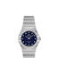 131.15.25.60.53.001 Omega The Omega Constellation Quartz 131.15.25.60.53.001 is a women's watch with a 25mm stainless steel case and a fixed bezel that is diamond-paved, adding a luxurious and sparkling touch to the watch. The crown is also made of stainless steel. The watch features a stunning blue aventurine glass dial with diamond hour markers and 18K white gold skeletonized hour hands. The Omega logo is located below the 12 o'clock position. The combination of the blue dial, diamonds, and white gold hands gives the watch an elegant and sophisticated look. The watch performs two functions: hours and minutes. It is powered by a quartz movement, specifically the Calibre 4061, which has a battery life of 48 months. The case thickness of the watch is 8.1mm, and the case back is solid. The front of the watch is protected by sapphire crystal, which is scratch-resistant and durable. The stainless steel bracelet with a folding buckle ensures that the watch stays securely on the wrist. The watch is also water-resistant up to 30m, which means it can withstand minor splashes and brief immersion in water. Overall, the Omega Constellation Quartz 131.15.25.60.53.001 is a stunning and high-quality luxury watch that combines elegant design with reliable performance. It is a perfect choice for women who want a luxurious and unique timepiece that can be worn for special occasions. The diamond-paved bezel and hour markers add an extra touch of luxury and make this watch truly special.