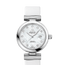 425.32.34.20.55.002 Omega. The Omega De Ville Co-Axial Master Chronometer 425.32.34.20.55.002 is an elegant and sophisticated lady's watch with a 34mm stainless steel case. The case is fixed with a stainless steel bezel and a stainless steel crown, adding to the durability and strength of the watch. The white pearled, mother-of-pearl dial is adorned with diamond hour markers, giving the watch a luxurious and glamorous look. The luminous white gold hands make it easy to read the time, even in low light conditions. The watch also features a date display at the 3 o'clock position, adding to its functionality. The watch is powered by a self-winding mechanical movement, which is powered by a Calibre 8520, providing reliable and accurate timekeeping. The watch has a power reserve of approximately 50 hours. The case back of the watch is transparent, allowing you to view the intricate workings of the movement. The watch features a white satin-brushed grained calf leather strap with a folding buckle, providing a comfortable and secure fit. The watch has a water resistance rating of up to 100 meters, making it suitable for swimming and snorkeling. Overall, the Omega De Ville Co-Axial Master Chronometer 425.32.34.20.55.002 is a beautiful and elegant timepiece with a functional and reliable design. The combination of the stainless steel case, mother-of-pearl dial, and diamond hour markers make this watch a luxurious accessory for any occasion.