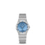 The dramatic and enduring design of the OMEGA Constellation is characterised by its famous half-moons, ''claws'' on the case and mono-rang bracelet.This 28 mm model, with case and bracelet in stainless steel, features indexes and applied elements in 18K white gold, set against a striking celestial blue dial.To give the bezel an extra pop of colour, OMEGA has highlighted the engraved Roman numerals in the same pastel shade.At the heart of this timepiece is the OMEGA Calibre 4061. Turning the watch over reveals a Constellation Observatory medallion stamped on the caseback. 3 bar (30 metres / 100 feet)