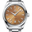 The saffron dial, fashioned from brass, is lacquered and sun-brushed from the centre. There is a date window at 6 o'clock and rhodium-plated hands and indexes filled with white Super-LumiNova. Central second hand.