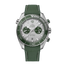 The dial is presented in brushed stainless steel and includes a date window at 6 o’clock, brushed green ceramic subdials, a green varnished number 12, along with transferred words in green and black. The OMEGA logo, hands, and hour markers are all in PVD stainless steel with a brushed finish, while the white Super-LumiNova improves visibility in dark conditions.