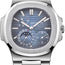 Preowned-5712/1A-001 Patek Philippe The Patek Philippe Nautilus Power Reserve 5712/1A-001 is a fusion of elegant design and mechanical sophistication. Housed within a sleek 40 mm Stainless Steel case, this timepiece epitomizes a balance of refinement and durability. The fixed Stainless Steel bezel seamlessly complements its overall aesthetic. The black-blue dial creates a captivating backdrop, featuring minute markers along the outer edge and applied hour markers adorned with luminescent coating, complemented by luminous hour hands. This watch offers a range of functions, including hours, minutes, seconds, power reserve indicator, moon phase, and date. Two additional dials further enhance its functionality—the sub-dial for small seconds positioned between 3 and 6 o'clock, and an additional dial indicating the moon phase and date between 6 and 8 o'clock. Notably, the power reserve indicator is prominently displayed between 10 and 11 o'clock. Powering this exceptional timepiece is a self-winding mechanical movement, the esteemed Calibre 240 PS IRM C LU, ensuring an impressive power reserve of approximately 48 hours. The movement boasts 29 meticulously placed jewels, exemplifying Patek Philippe's commitment to precision. With a case thickness of 8.52 mm, the watch maintains a sleek and refined profile. The transparent case back provides a fascinating view of the movement within, complemented by a sapphire crystal protecting both the front and back of the watch. Completing the ensemble is a Stainless Steel bracelet, fastened securely by a folding clasp buckle, enhancing the overall elegance and comfort of the timepiece. This model not only embodies style but also offers practicality with a water resistance of up to 60 meters, underscoring Patek Philippe's dedication to enduring craftsmanship and versatility.