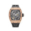 Indulge in the luxury design of the RM 030. It features a 48mm 18k rose gold and titanium case, a black skeletal dial with luminous white Arabic numerals, enlarged date display, the RMAR1 Caliber automatic movement and finished on a black rubber strap. The declutchable rotor prevents the build up of harmful debris inside of the winding barrel.