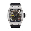 This Richard Mille RM 029 is crafted in a white gold case measuring 48mm. The case is adorned with factory market diamonds, surrounding a transparent dial. The watch comes on a black rubber bracelet.
