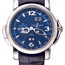 Preowned-320-60 Ulysse Nardin. The Ulysse Nardin Classical GMT Perpetual 320-60 is a horological masterpiece that blends timeless elegance with perpetual precision. Encased within a 42mm 18K white gold frame, this watch exudes an aura of luxury and refinement. The fixed 18K white gold bezel frames the essence of time with understated opulence. The deep blue-tone dial serves as a celestial canvas, complemented by silver hands and index hour markers that shimmer like constellations in the night sky. At the cardinal points of 12, 3, and 6 o'clock, Arabic numerals provide bold accents, guiding your gaze with unwavering clarity. In the heart of this dial, day and date windows converge, merging with harmonious synchrony. At the 9 o'clock position, a seconds sub-dial patiently counts the passing moments. The GMT perpetual calendar, a feat of horological engineering, elegantly resides at the 6 o'clock position, while the date indicator marks time's passage at 1 o'clock. Minute markers grace the outer rim of the dial, ensuring precision to the very second. The black alligator leather strap, a testament to classic aesthetics, fastens securely with a deployant clasp, ensuring comfort and style. The automatic movement within, a testament to Ulysse Nardin's watchmaking prowess, boasts a reliable 42-hour power reserve, ensuring that time remains your faithful companion. Though not designed for underwater exploration, this timepiece can withstand the occasional splash, with water resistance up to 30 meters, or 100 feet. The Ulysse Nardin Classical GMT Perpetual 320-60 is more than a watch; it's an embodiment of enduring elegance and precision. It's a reminder that time, like this exceptional timepiece, transcends the mundane, embodying the very essence of perpetual beauty.