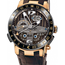 Preowned-322-00 Ulysse Nardin. This watch has a 43 mm 18K Rose Gold case. Ceramic bezel with a GMT function display. Bronze dial with blackened skeleton hands. Arabic numeral marker at 6 and 12 o’clock position. Date window is located between the 1 and 2 o’clock position. Month window is located at the 3 o'clock position, Day window – at the 9 o’clock position, Day of the month - at the 6 o’clock position. Minutes and seconds indication are located at 9 o’clock position. Alligator black leather strap with 18K Rose Gold Fold-over buckle. Automatic movement is powered by a UN-32 Caliber. Power reserve of 45 hours. Water resistant up to 100 m. / 330 ft.