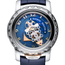 Preowned–020-88 Ulysse Nardin The Ulysse Nardin Freak 020-88 is a truly groundbreaking men's watch, pushing the boundaries of traditional watchmaking with its innovative design and remarkable features. It's a masterpiece of horology and a testament to Ulysse Nardin's commitment to craftsmanship. With a substantial 44.5mm 18K white gold case, the watch combines elegance and robustness. The bi-directional rotating bezel adds a modern touch to the design. The watch has a unique way of indicating time. It doesn't have traditional hands or a dial. Instead, it uses a revolutionary system where the movement itself rotates to tell the time. An arrow, located on the mainspring cylinder, points to the hour as the top axle, housing a balance wheel and the Dual Ulysse Escapement, completes one rotation per hour. During this rotation, the upper bridge reveals the time. The central axis rotates within the sapphire crystal of the case, creating a mesmerizing and unique time-telling experience. This watch doesn't have a crown in the traditional sense. The spring, located under the mechanism and covering the entire diameter of the case, provides an impressive power reserve of 7 days. To wind the watch, you simply turn the case back counterclockwise. A port on the back of the case allows you to see the spring coils, adding to the watch's intricate design. The bezel can be locked or unlocked by a lever at the 6 o'clock position between the lugs, adding an element of functionality to the timepiece. The movement, UN Caliber 200, beats at 28,800 vibrations per hour, comprises 28 jewels, and offers an approximate power reserve of 7 days. The watch performs the essential functions of hours and minutes, with the added charm of a tourbillon for precision. With a case thickness of 13.6mm, the watch maintains a sleek and modern profile. The transparent case back, protected by sapphire crystal on both sides, allows you to admire the watch's intricate inner workings. The ensemble is completed by a leather strap, fastened with an 18K white gold clasp, offering both comfort and style. With water resistance up to 30 meters (98 feet), this timepiece may not be designed for deep dives, but it's a perfect companion for special occasions and watch enthusiasts. The Ulysse Nardin Freak 020-88 is more than just a watch; it's a symbol of innovation, craftsmanship, and a unique way of experiencing time. It's designed for those who appreciate pushing the boundaries of traditional watch design and embracing new horological frontiers.
