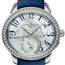 Preowned - 3103-125B/591.3 Ulysse Nardin . The Ulysse Nardin Jade 3103-125B/591.3 is an exquisite timepiece that seamlessly combines elegance, craftsmanship, and practical features. It's a symbol of luxury and attention to detail, designed for those who appreciate both style and functionality in their wristwear. The watch boasts a 36x39mm stainless steel case, radiating timeless sophistication. The fixed stainless steel bezel, adorned with diamonds, adds a touch of luxury and brilliance to the design. The mother of pearl dial serves as a stunning backdrop for blue-tone Arabic numerals and skeletonized hands, which display both hours and minutes with precision. The small sub-dial at 6 o'clock, marked with a delicate wavy line and set with diamonds, indicates the seconds. A date window is conveniently located at 6 o'clock, adding practicality to the watch. The watch performs multiple functions, and the pusher at 4 o'clock is used to select the crown function, displayed at 2 o'clock. This allows for setting the time or date and winding the watch accordingly. The self-winding mechanical movement, powered by Calibre UN-310 with 41 jewels, offers a reliable power reserve of approximately 48 hours, ensuring accurate timekeeping. The transparent case back allows you to admire the intricate inner workings of the watch, and it's protected by sapphire crystal on both sides. The Ulysse Nardin logo graces the dial just below the 12 o'clock position, representing the brand's commitment to excellence. The blue satin strap, secured with a folding clasp, adds both comfort and style to the ensemble. With water resistance up to 30 meters (98 feet), this timepiece is suitable for everyday wear and light water-related activities. The Ulysse Nardin Jade 3103-125B/591.3 isn't just a watch; it's a symbol of luxury, craftsmanship, and precision. It's designed for those who appreciate the fusion of elegant design with practical features in a timepiece that's perfect for both formal occasions and daily wear.