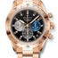 18.3101.3600/21.M3100 Zenith. The Zenith Chronomaster Sport 18.3101.3600/21.M3100 is a men's watch with a 41 mm 18K Rose Gold case with a fixed bezel. The black dial has three different colored counters, index hour markers, and gold-tone hands, which make for easy readability. The automatic movement has a power reserve of 60 hours, providing excellent reliability and accuracy. The central chronograph hand makes one turn in 10 seconds, while the 60-minute counter is located at the 6 o'clock position, and the 60-second counter is at 3 o'clock. The watch also features hours and minutes in the center, with small seconds at 9 o'clock. The 18K Rose Gold bracelet with gold triple folding clasp is comfortable to wear and adds an elegant touch to the watch's overall design. The water resistance of up to 100 meters (330 feet) makes this watch suitable for swimming, snorkeling, and other water activities but not recommended for deep-sea diving. In summary, the Zenith Chronomaster Sport 18.3101.3600/21.M3100 is an exquisite men's watch that blends functionality with sophistication. The black dial and 18K Rose Gold case and bracelet create a striking contrast, making it a perfect accessory for any formal occasion.
