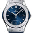 511.NX.7170.RX Hublot. The Hublot Classic Fusion Automatic 511.NX.7170.RX is a luxurious timepiece with a 45.00mm titanium case and a fixed bezel. The blue dial features silver tone hands and index hour markers, creating a striking contrast that adds to the watch's overall elegance. The scratch-resistant and anti-glare sapphire crystal protects the dial, ensuring durability and clear visibility in any lighting conditions. This watch also features a date window positioned at 3 o'clock, adding a practical touch to the watch's design. The blue rubber strap with deployant clasp is comfortable to wear and easy to adjust, while the automatic movement with a power reserve of 42 hours ensures accurate timekeeping. The Hublot Classic Fusion Automatic 511.NX.7170.RX is water resistant up to 50m/150ft, making it suitable for swimming and snorkeling. Overall, this watch is a stunning luxury timepiece with a sleek and modern design, perfect for anyone looking for a high-end watch that combines both style and functionality.