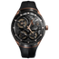 Muted grey detail on the outer hour/minute ring. Black open-work dial and rose-gold tone hands.