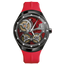 The Accutron DNA Casino collection makes a futuristic and bold statement with four new color ways: green, blue, orange, and red, that echo the neon city skyline and the bright atmosphere of Las Vegas and its iconic casinos. The Accutron DNA Casino watches honor the past with the signature open-face design, but also look ahead to the future, using a proprietary electrostatic energy movement with an intricately engineered motor and turbine system that generates power and the smooth forward glide of the second hand. This timepiece features a 45.1mm stainless steel case in grey finish with silver-grey accent on the outer hour/minute ring, red colored open-work dial and silver-tone hands. With stamped Accutron logo and turbine design on the red case back, this watch is finished with an integrated high-tech red rubber strap with double-press deployant closure and a red crown matching the open work dial. Historically the brand has used numbers to reference their watches and for this new collection, Accutron has included time stamps on the case back to differentiate each of the colors. Limited Edition of 100 pieces each.