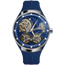 The Accutron DNA Casino collection makes a futuristic and bold statement with four new color ways: green, blue, orange, and red, that echo the neon city skyline and the bright atmosphere of Las Vegas and its iconic casinos. The Accutron DNA Casino watches honor the past with the signature open-face design, but also look ahead to the future, using a proprietary electrostatic energy movement with an intricately engineered motor and turbine system that generates power and the smooth forward glide of the second hand. This timepiece features a 45.1mm stainless steel case in grey finish with silver-grey accent on the outer hour/minute ring, blue colored open-work dial and silver-tone hands. With stamped Accutron logo and turbine design on the blue case back, this watch is finished with an integrated high-tech blue rubber strap with double-press deployant closure and an orange crown matching the open work dial. Historically the brand has used numbers to reference their watches and for this new collection, Accutron has included time stamps on the case back to differentiate each of the colors. Limited Edition of 100 pieces each.