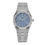 The Audemars Piguet Royal Oak Selfwinding 77353BC.GG.1263BC.01 is crafted in a 34mm frosted white gold case. The light blue dial is in the 'Grand Tapisserie' pattern and hosts a date feature at 3 o'clock. The watch is styled on a matching frosted white gold bracelet with the AP folding clasp.