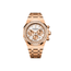 This Royal Oak Chronograph is designed in a 38mm 18-carat rose gold case and octagonal-shaped bezel set with brilliant-cut diamonds. It features the recognizable 'Grande Tapisserie' pattern on the silver-toned dial with rose gold counters, markers and hands. The watch is complimented by a rose gold bracelet with AP folding-clasp.