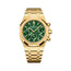 This magnificent Royal Oak Chronograph timepiece features a 18kt yellow gold case that measures 41mm in diameter. The dial is designed in a bright green color with the 'Grande Tapisserie' pattern, green counters, yellow gold applied hour-markers and Royal Oak hands with luminescent coating. The watch comes on a yellow gold bracelet with an AP folding clasp. It comes with an additional green rubber strap.