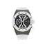 The Audemars Piguet Royal Oak Concept GMT Tourbillon embodies the iconic Royal Oak shape with an updated futuristic feel, this timepiece is equipped with an octagonal bezel and dial-free architecture. The 44mm titanium case features a black anodized aluminum bridge over an open-worked hand-wound movement. It comes on a white rubber strap with a titanium AP folding-clasp and glareproof sapphire-crystal caseback.
