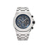 The Audemars Piguet Royal Oak Offshore 25721TI.OO.1000TI.01 Chronograph is designed in a 42mm titanium case, a silver dial with a Grande Tapisserie pattern hosting navy sub-dials and is styled on a titanium bracelet. Luminescent hands work with the Sapphire glare-proofed crystal for optimal legibility in any condition. Complications include chronograph, date, and tachymeter functions.